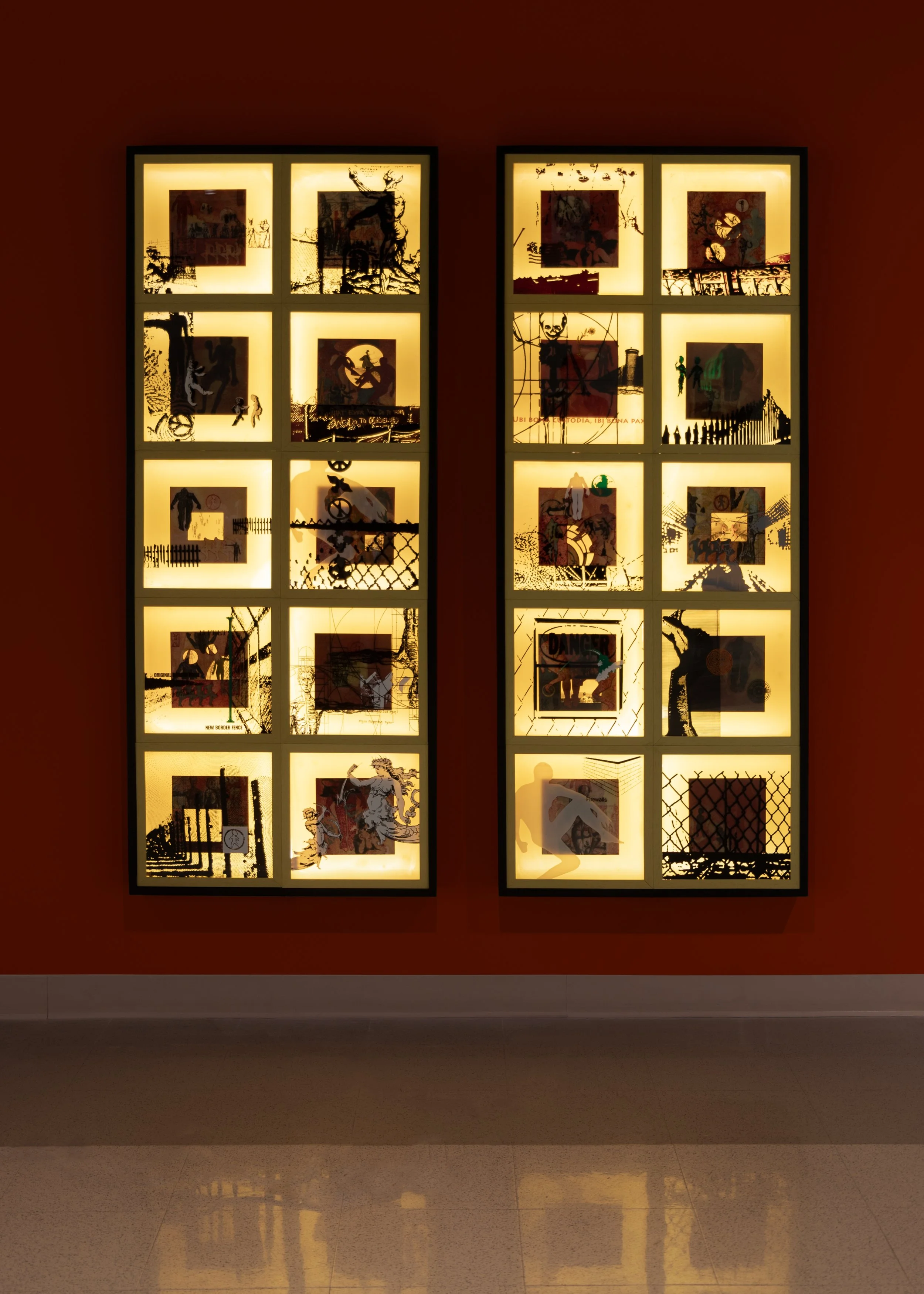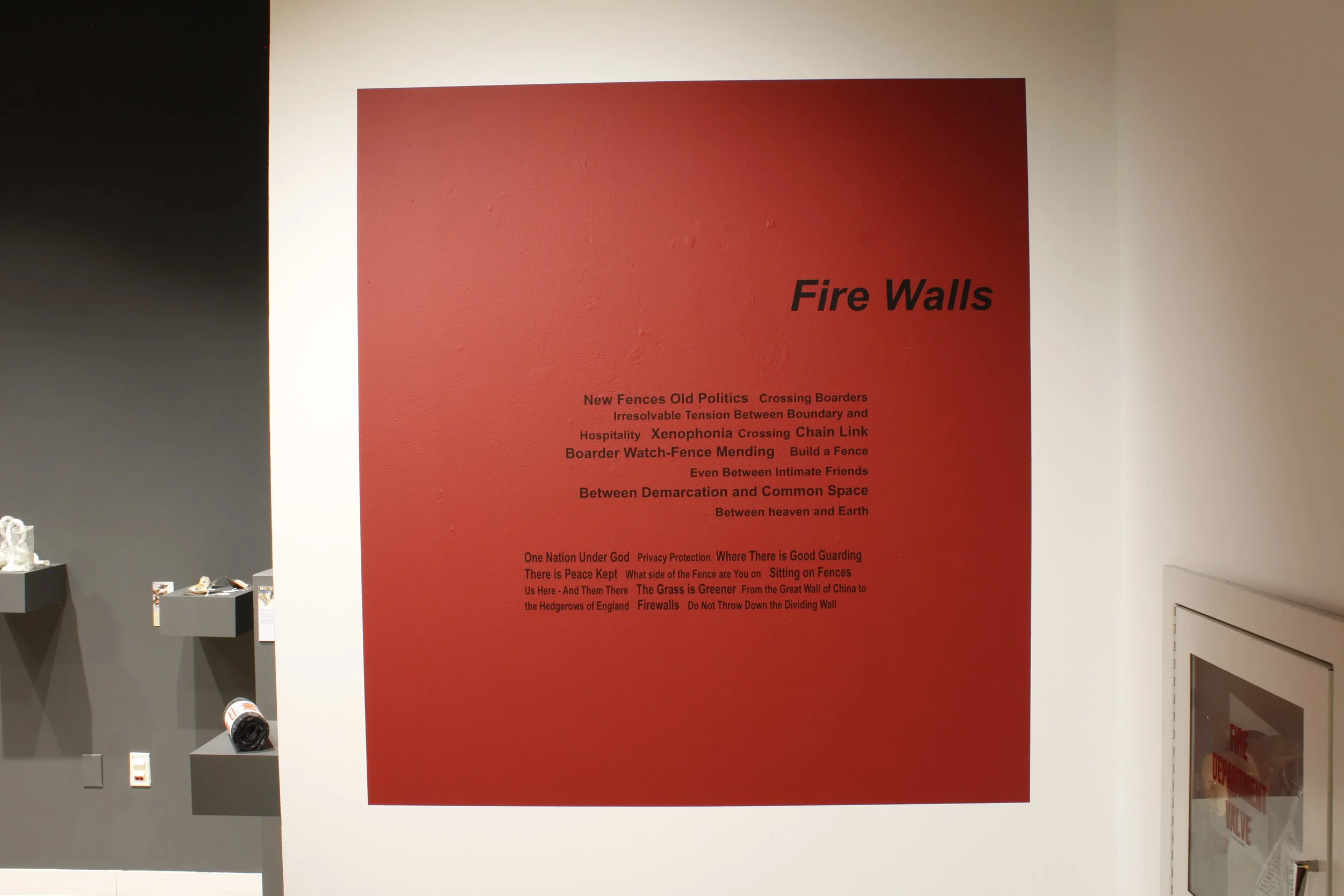 With all its layered imagery, Garlockβs work builds meaning and amasses a physicality truer with the mess of lived experience by stacking, splicing, and combining printed elements, Garlockβs βFirewallsβ seriesβmade in the cultural din of the post-9/11 worldβcombines multiple printing techniques, including screenprints, collagraphs, and gel transfers. These pieces distort space and scale in isolating scenes that read as warning signs. Anatomical drawings are stacked behind chain-link fences; pickets and bricks pen in the abstracted shapes of people. An American flag appears red and bloodied over a contemplative cherub; the word βDANGERβ is emblazoned over tangled bodies. An amalgamation of hot button issues like immigration and war are tangled up in the layers of these images. The flag, the neoclassical symbolism. By combining images and prints on plexiglass, Garlock conveys the complexityβthe multiplicityβof the American myth, and varieties of violence underpinning it.