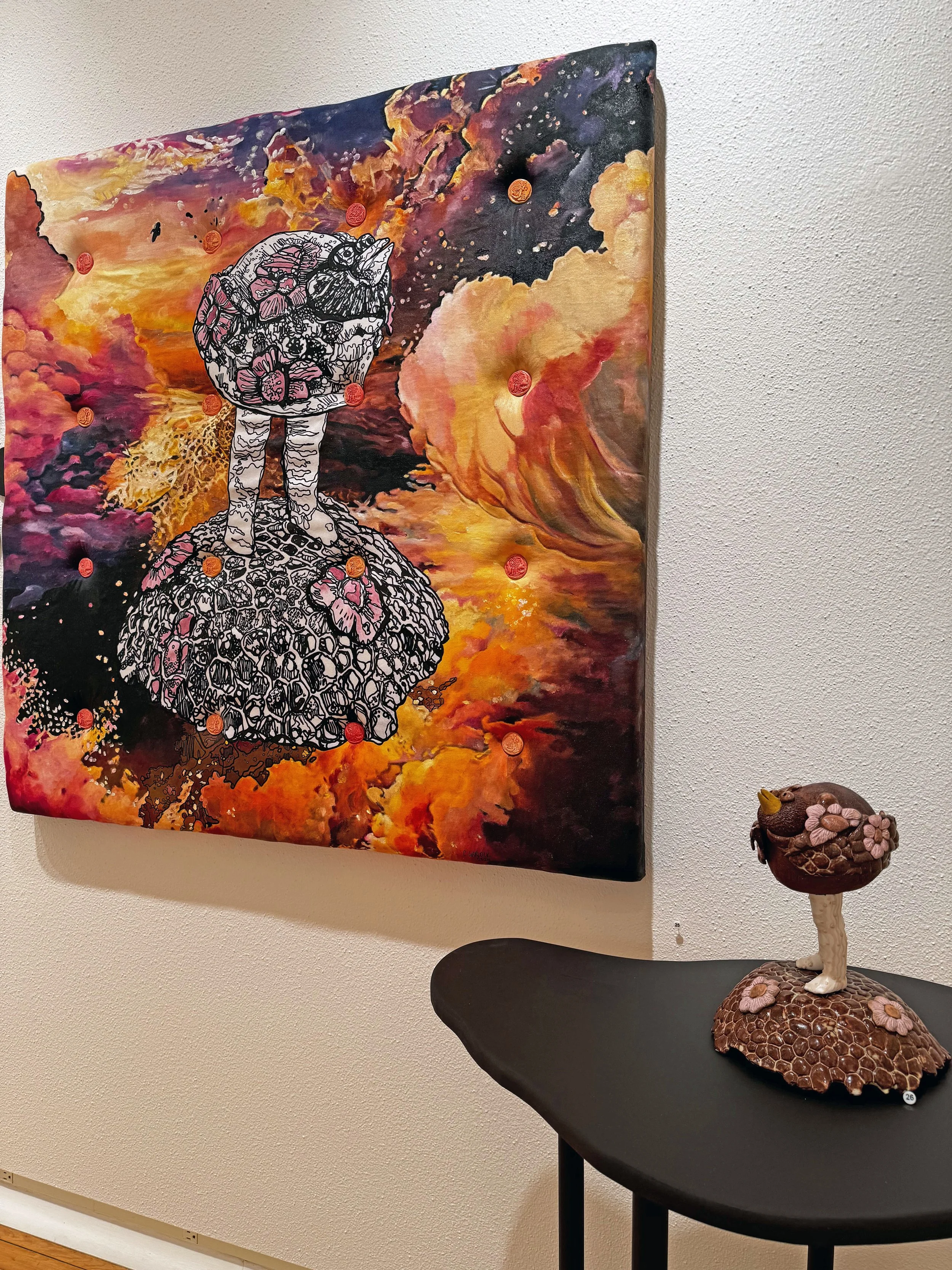 Hope Springs – Stillwater Imaginings Acrylic, foam, ceramic buttons 48”x48”x3” 2024 and FOR THE BIRD SERIES “Spring” Ceramics Cone 5 recycled clay and porcelain sculpture 12”Hx9”Wx9”D 2022
