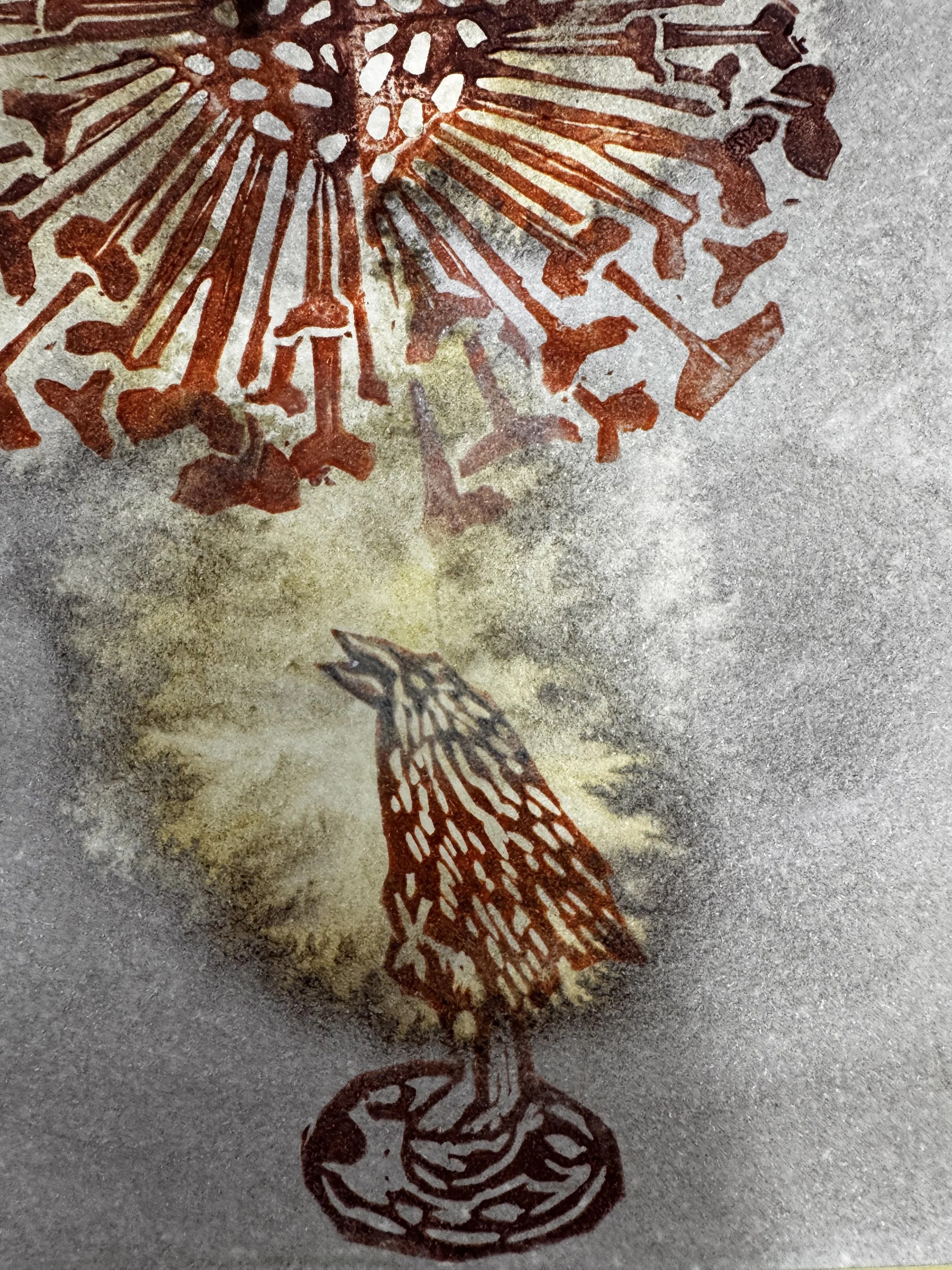 The composition features asymmetrical balance, with a large sunburst relief stamp in the top left dominating the scene, while a smaller bird image below remains subdued. The contrast between dark brown ink and a light gray background highlights the central motifs. The bird, positioned beneath a luminous yellow halo, draws attention, while the sunburst's size and complexity make it a focal point as well. The lines of the sunburst guide the viewer's gaze to the bird, creating a visual flow. The exaggerated size of the sunburst compared to the bird suggests grandeur and a potential symbolic hierarchy.
