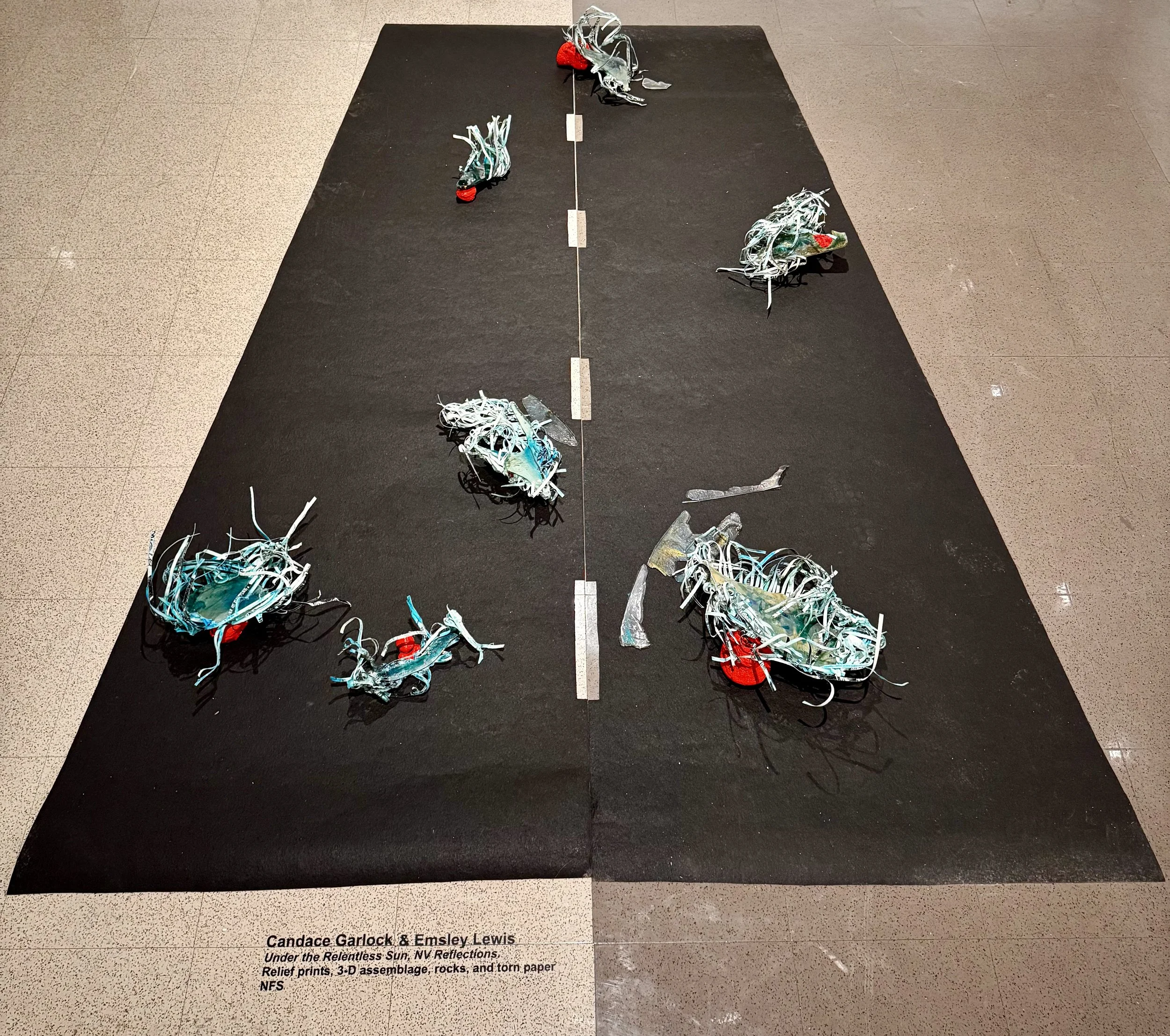 “Under the Relentless Sun” series started as an installation piece created by myself, Candace Garlock, and my youngest granddaughter, Emsley Lewis, in 2025. This is a project we did together, reflecting upon our many adventures on the road, especially a trip to the Black Rock Desert. We had to drive the lonely highway north and then drive across the playa. We were searching for the elusive geodes under the black rock landscape. We collected rocks but no luck finding geodes. We did encounter road construction and were inspired by the reflective orange cones. The rocks in the installation were painted with the orange color and act as a metaphor for humanity’s constant presence in the desert. The shredded pieces of older prints and discarded wood were transformed into puddles of water surrounded by the symbolic wisps of wind in the form of paper tumbleweeds. The digital art combines photos from road trips and interpreted drawings of the installation.